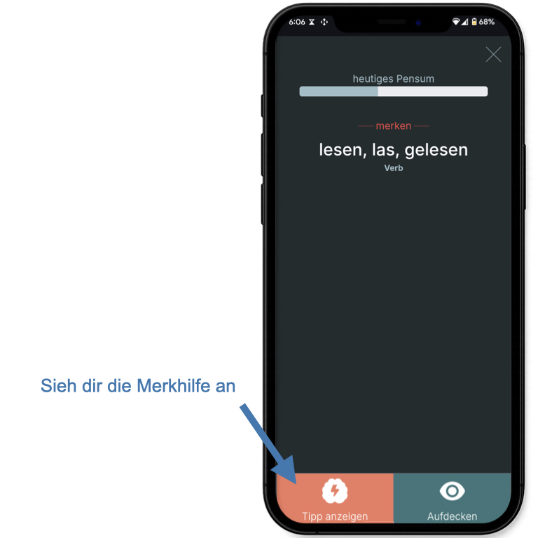 Wenn du dich nicht vollständig an eine Vokabel erinnern kannst, klicke auf „Tipp anzeigen“. Dir werden nun verschiedene Merkhilfen gezeigt. Klicke auf „Aufdecken“, sobald du dir sicher bist. Ansonsten klicke auf „weitere Merkhilfe“.